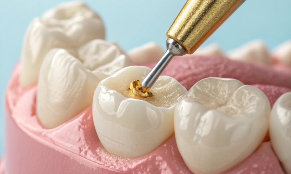 ۴. پالیش و تنظیم بلندی: در نهایت دندان پالیش شده تا سطح آن صاف و براق شود و بلندی آن با دندان‌های مقابل تنظیم می‌گردد.